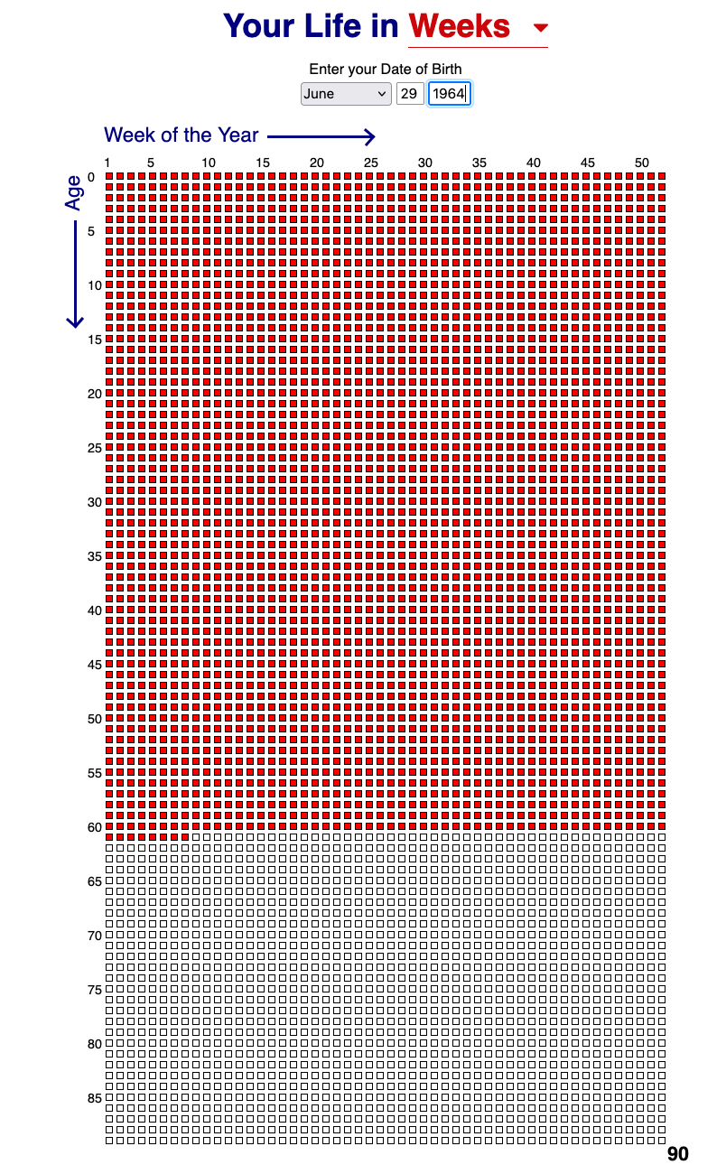 Now, I don’t sit in front of a memento mori every morning or otherwise dwell on death. But I have absorbed enough Stoicism to know I should regularly remind myself of the inevitable and then live accordingly. At age 61, I have many more days behind me than ahead, as this helpful weeks-of-your-life calendar demonstrates.